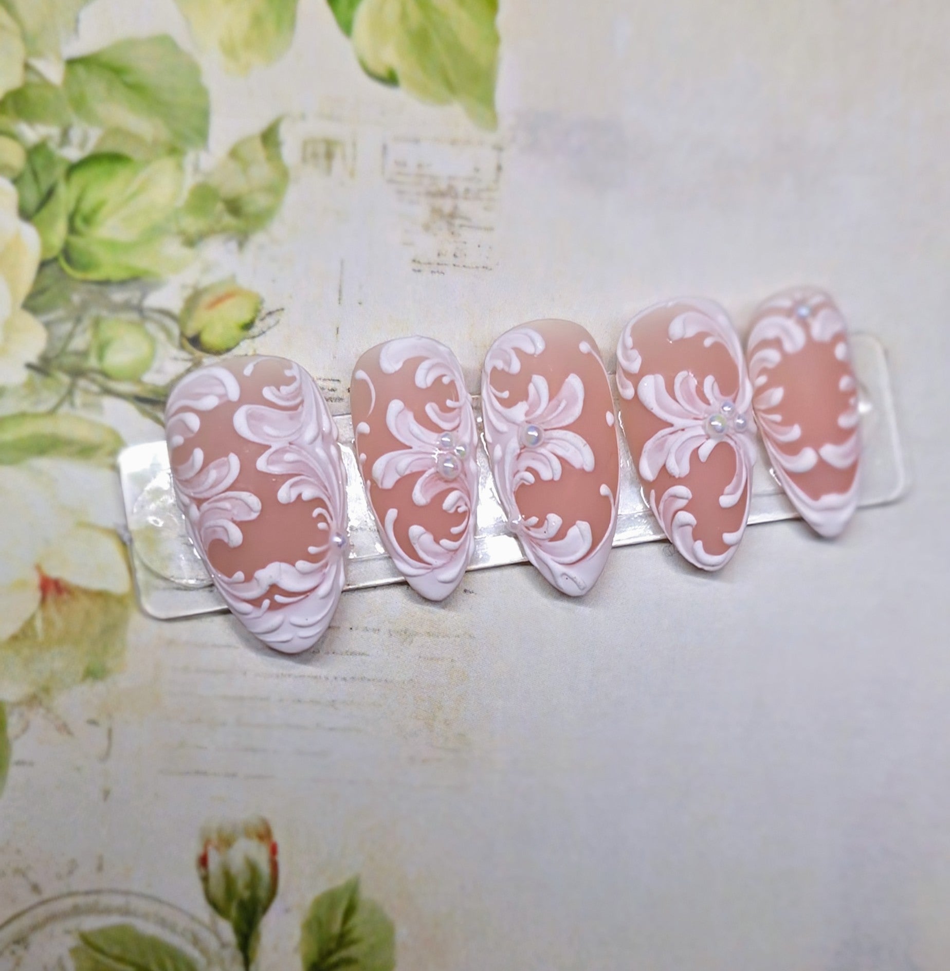 As you prepare to walk down the aisle, imagine your hands adorned with this elegant nail art, complementing your bridal ensemple. Wether you are wearing a classic gownor a modern design, lace and pearls can beautifully enhance your overall look, reflecting your personal style.
