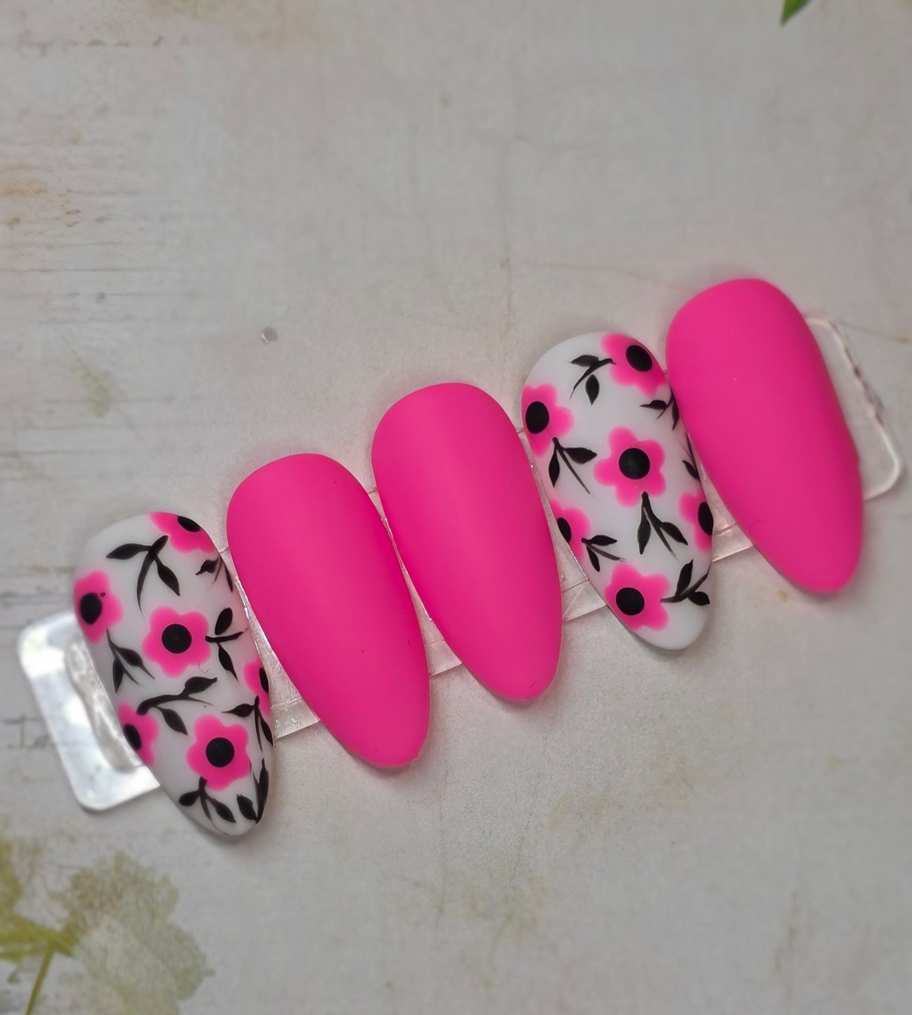 Radiating vibrant neon pink huess, showcasing stunning floral designs that pop with color and charm. Perfect for the fashionista who loes to stand out, these nails combine fun and flair for any ocasion- from beavh parties to brunch dates!