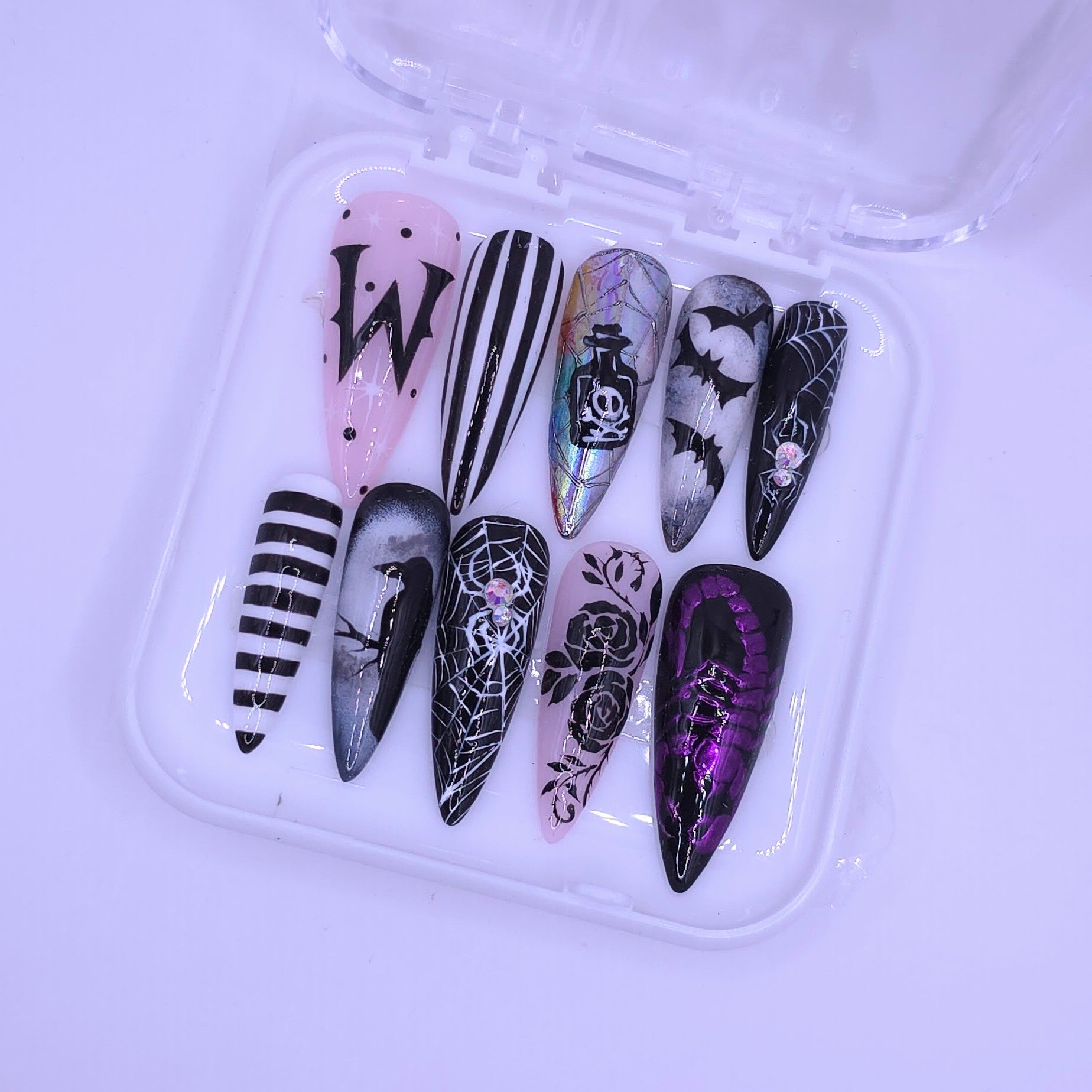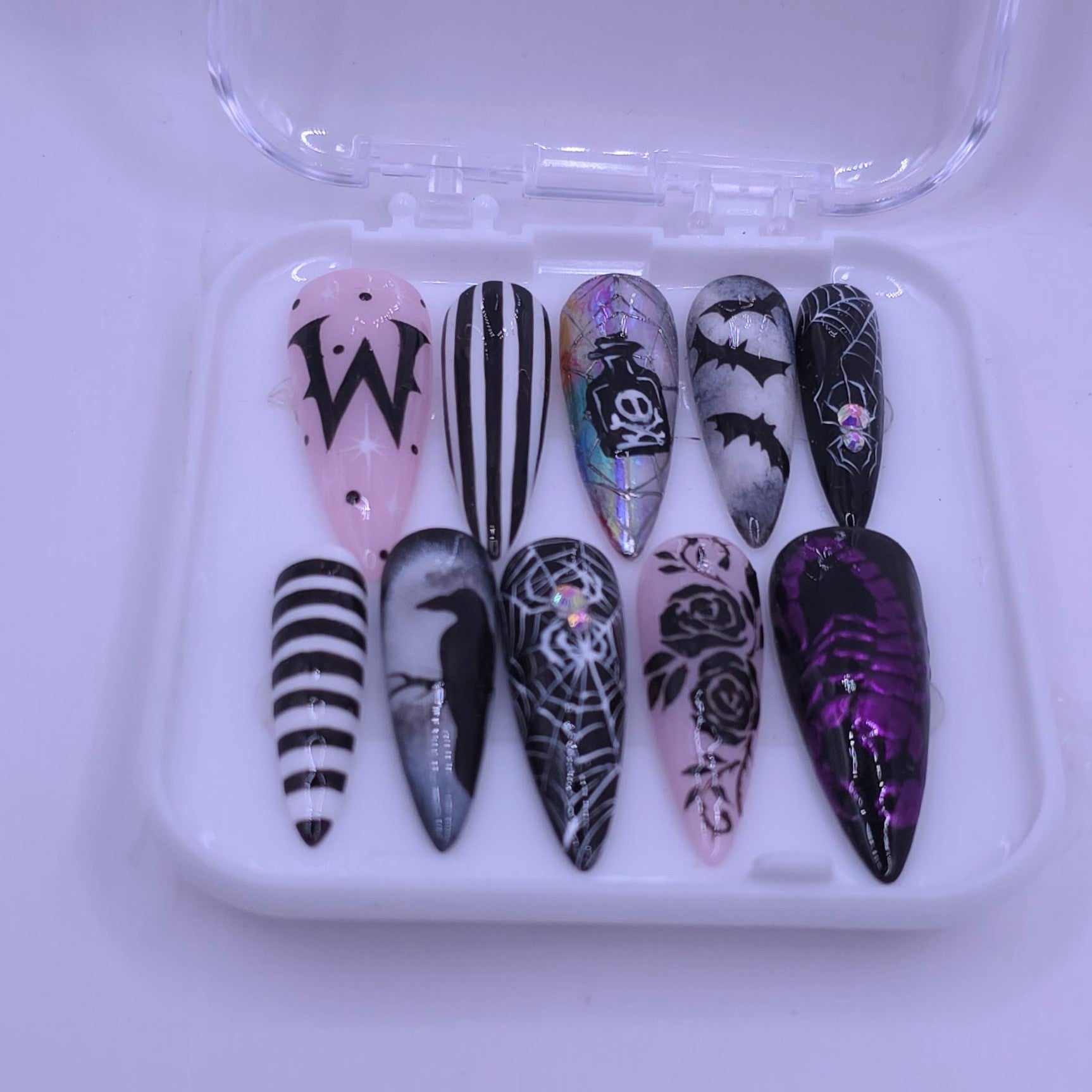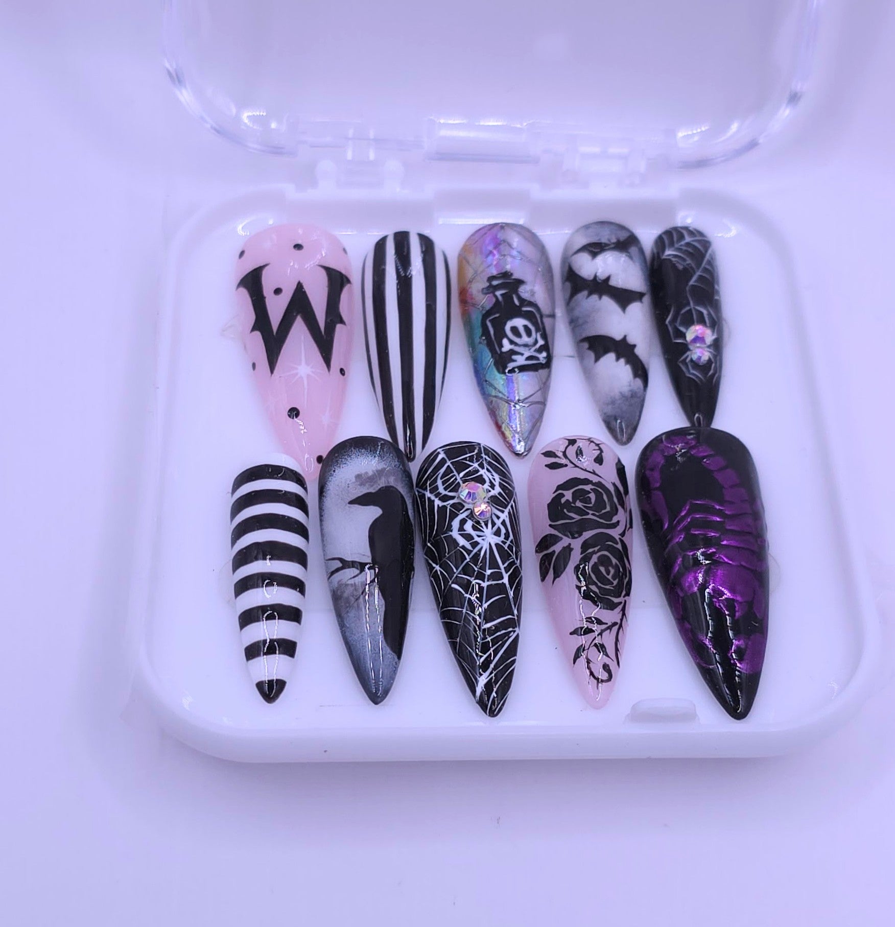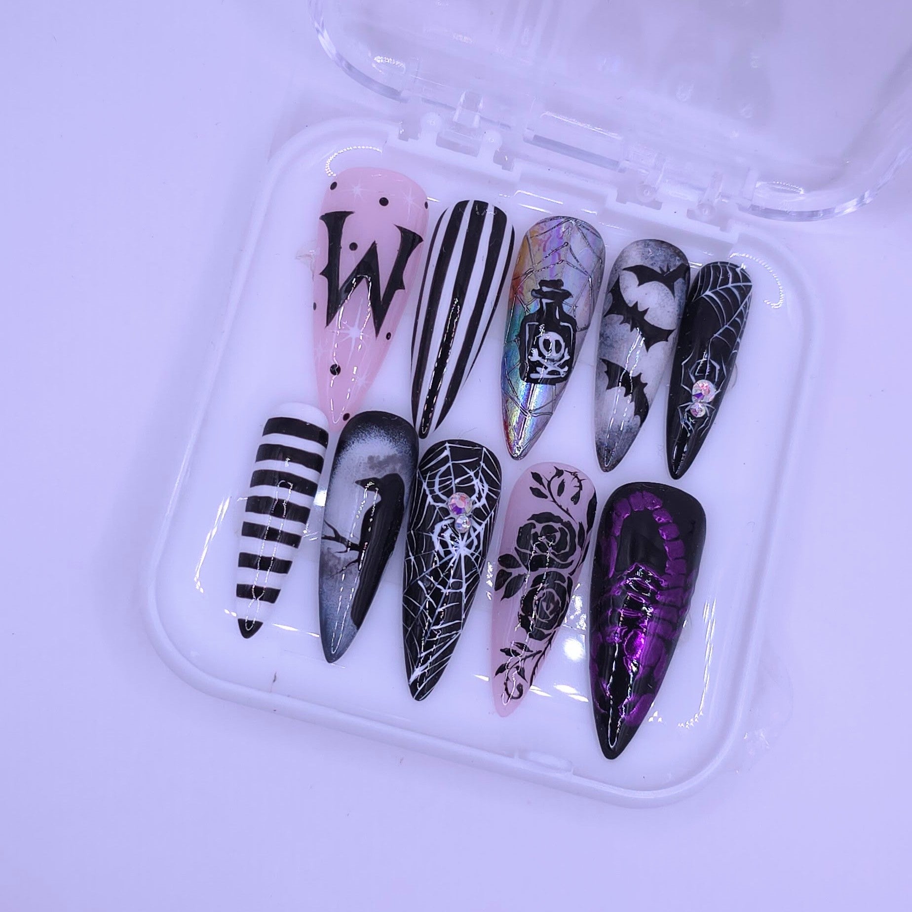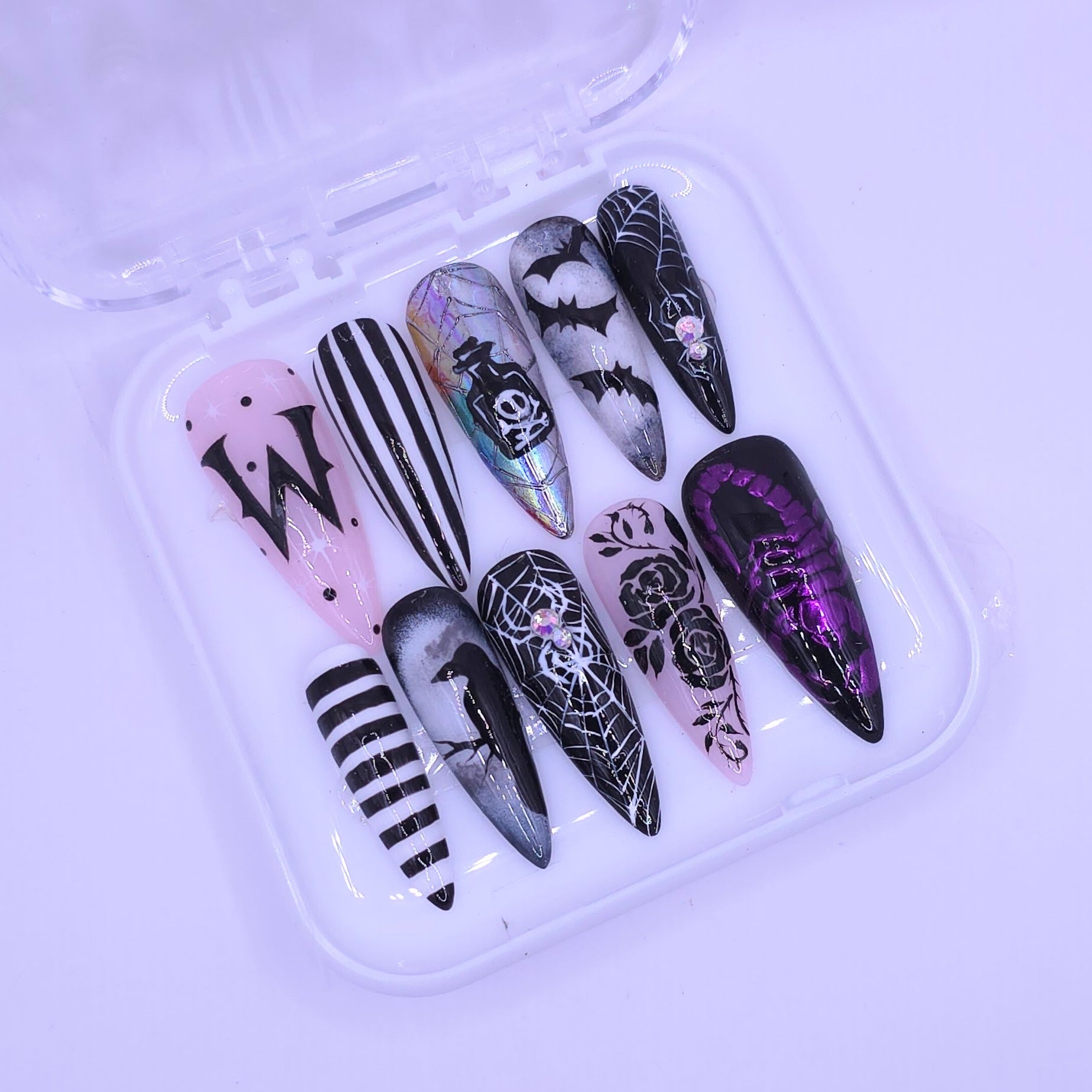 Enbrace your inner gothic glam with our Wednesdqay Addams Press-on nails set. Inspired by the iconic character's unique style, this nail set combines whimsy with a touch of darkness, perfect for those who appreciate a blend of elegance and edge.